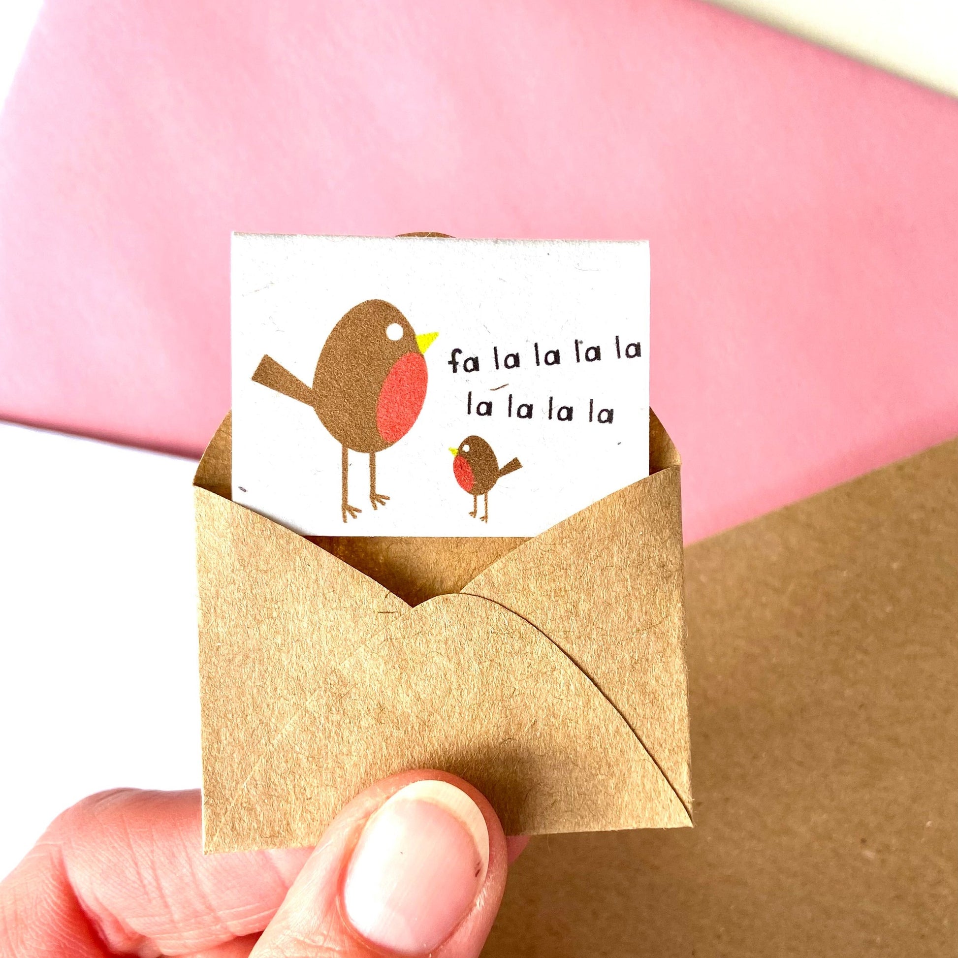 // Printed on 100% recycled FSC Certified card and supplied with tiny recycled brown paper envelopes and miniature biodegradable stickers for sealing closed